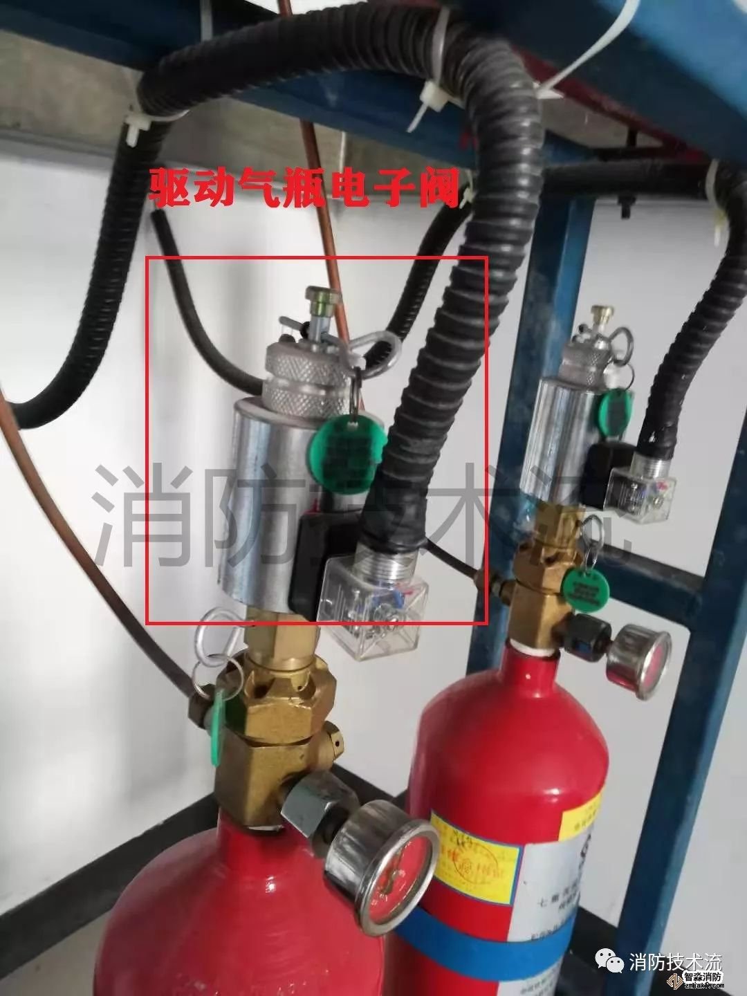 图六:驱动气瓶上的电磁阀,由电信号控制开启,电动启动失败时也可通过拔掉保险销手动按下应急启动(每个驱动气瓶对应一个气体防护区,按下可启动对应防护区的选择阀及灭火剂储气瓶释放气体灭火)