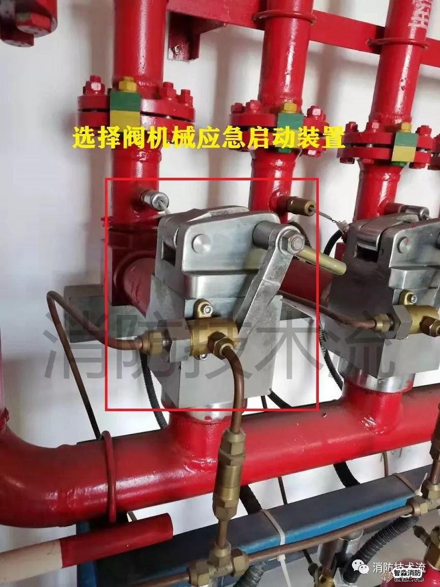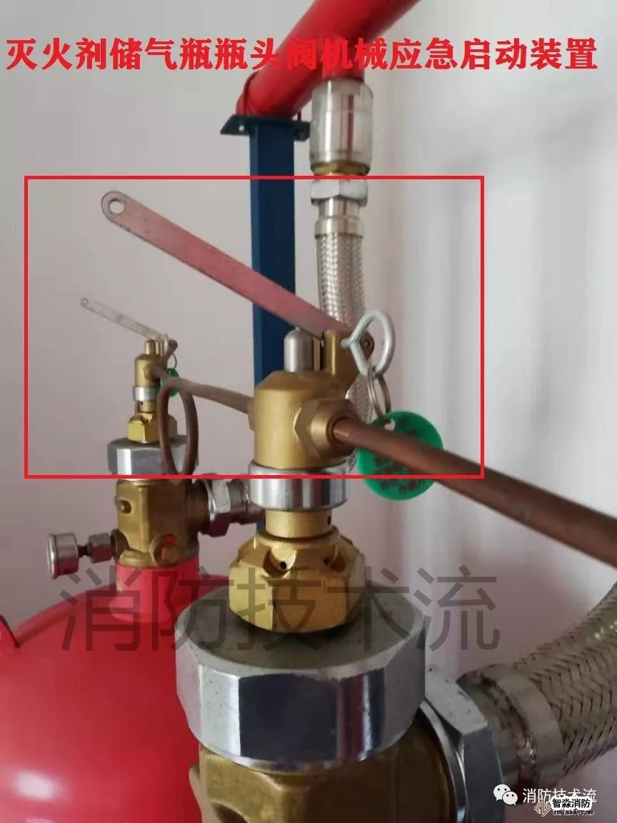 图二:灭火剂储气瓶瓶头阀的机械应急启动装置,当自动启动失效时,拔掉保险销,压下手柄开启瓶头阀释放灭火剂(此操作前需打开对应气体防护区的选择阀)