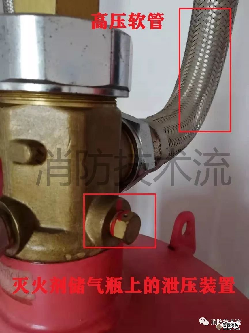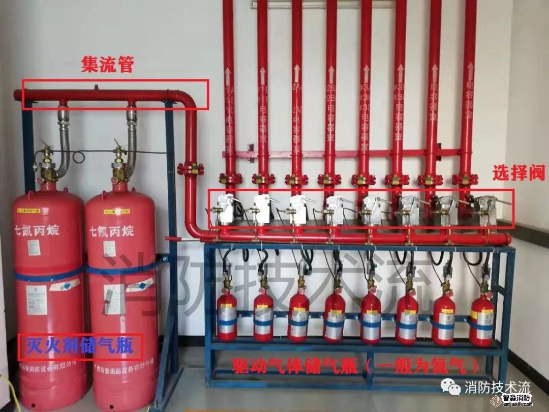 内贮压式气体灭火系统一般由灭火剂瓶组、驱动气体瓶组、单向阀、选择阀(适用于组合分配系统)、驱动装置、集流管、高压软管、喷嘴、信号反馈装置(压力开关)、安全泄压装置、控制盘、低泄高封阀(适用于具有驱动气体瓶组的系统)、管路管件等部件构成。