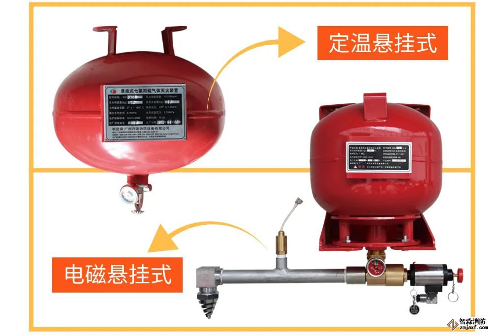 悬挂式七氟丙烷自动灭火装置是无管网气体灭火装置(也称预制灭火系统)的一种,是按一定的应用条件,将灭火剂储存装置和喷放组件等预先设计、组装成套且具有联动控制功能的灭火系统。悬挂式七氟丙烷自动灭火装置又分为电磁悬挂式和定温悬挂式两种,电磁式由灭火剂储存罐体、电磁驱动部件、喷头、压力显示部件、信号反馈部件组成;定温式由灭火剂储存罐体和感温带表喷头组成。