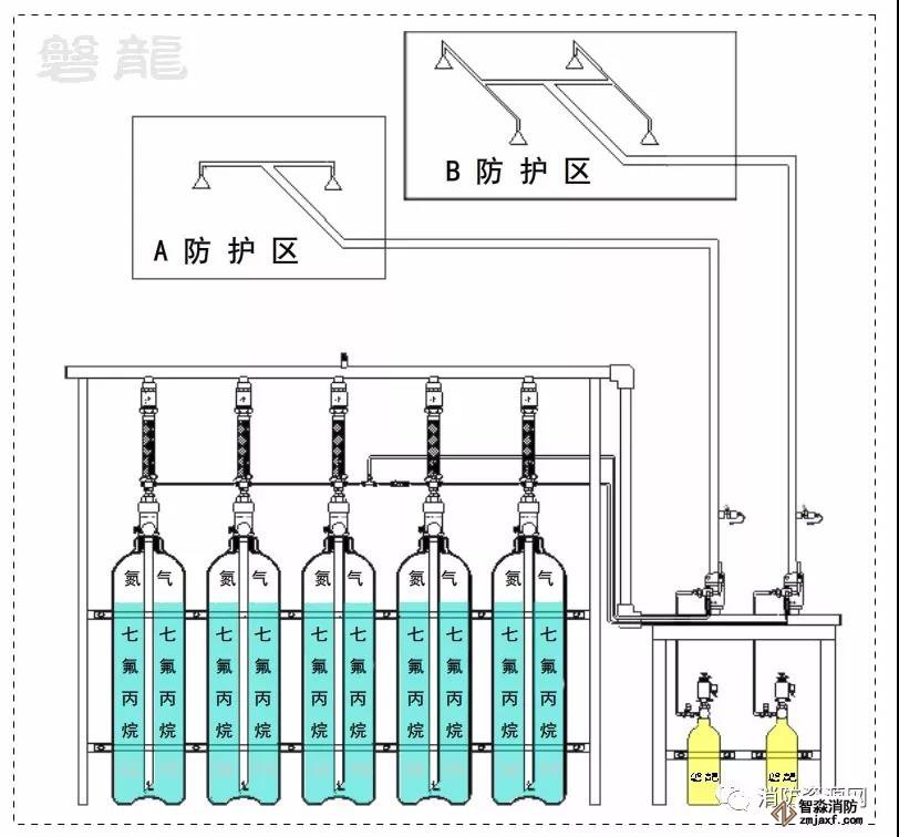 在外贮压式的七氟丙烷系统中,高压氮气贮存在动力瓶组中;七氟丙烷药剂贮存在药剂瓶组中。当系统启动时,动力瓶组中的高压氮气经减压阀释放至药剂瓶组,推动七氟丙烷灭火剂释放至防护区。